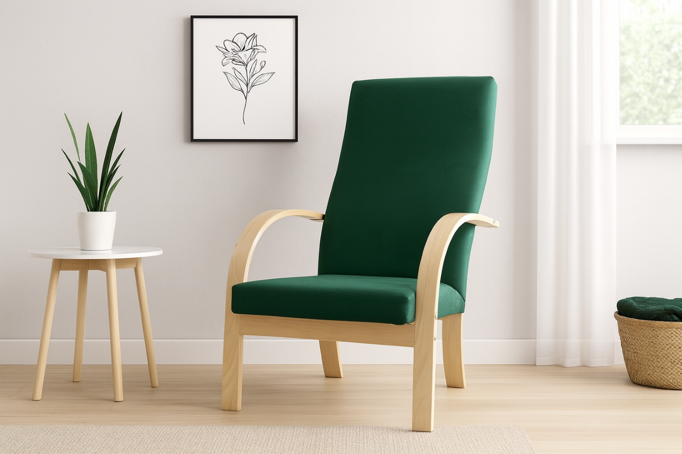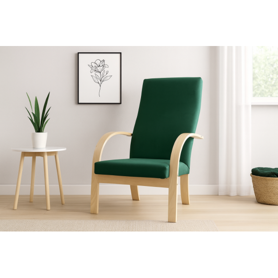 Fotel Finka to fotel o wysokim i dużym oparciu, wyprofilowane podłokietniki zapewniają wyjątkowo wygodny wypoczynek po ciężkim dniu. Drewniany stelaż wykonany z litego drewna bukowego gwarantuje wysoką wytrzymałość oraz jakość. Uzyskano w ten sposób niezwykle wygodną i mocną konstrukcję o bardzo dużej sztywności. Fotel finka to idealne uzupełnienie każdego salonu czy pokoju.