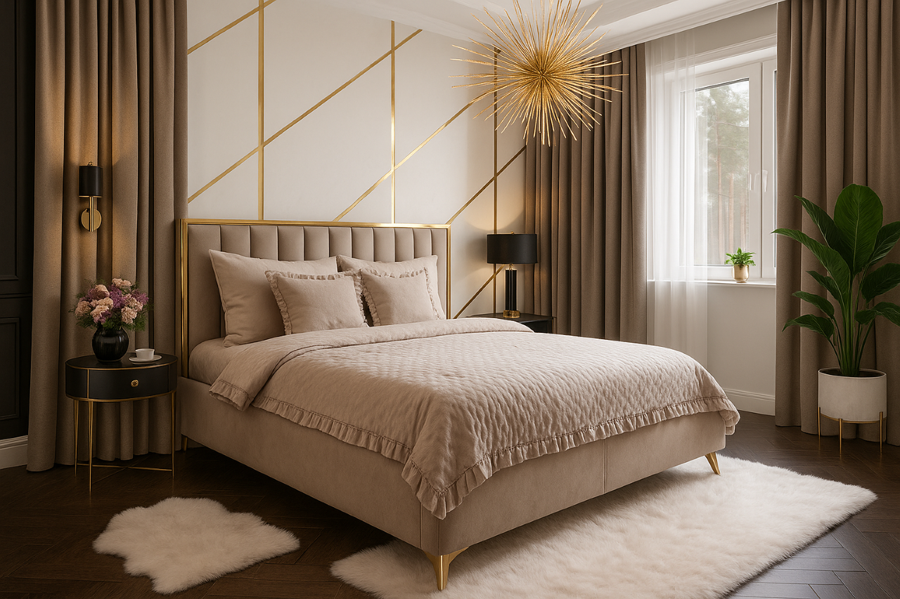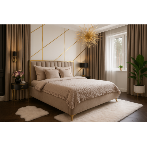 Łóżko do sypialni Magnat ze złotą taśma na zagłówku idealnie sprawdzi się w sypialniach eleganckich.