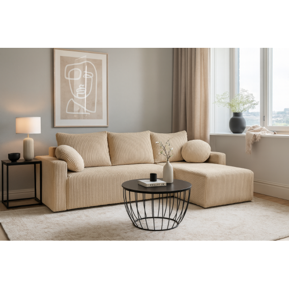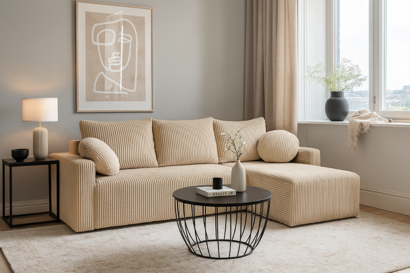 Narożnik dzięki tkaninie prążkowej sprawia, że pomieszczenie jest ciepłe i przytulne.