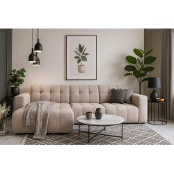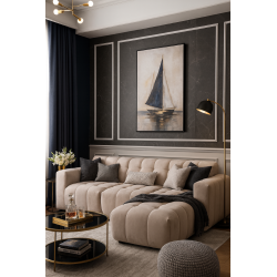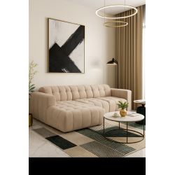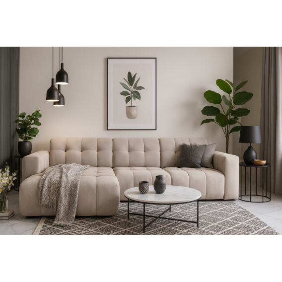 Nowoczesny design. Narożnik bez funkcji spania i pojemnika na pościel. Ekskluzywna bryła mebla, charakterystyczne przeszycia.