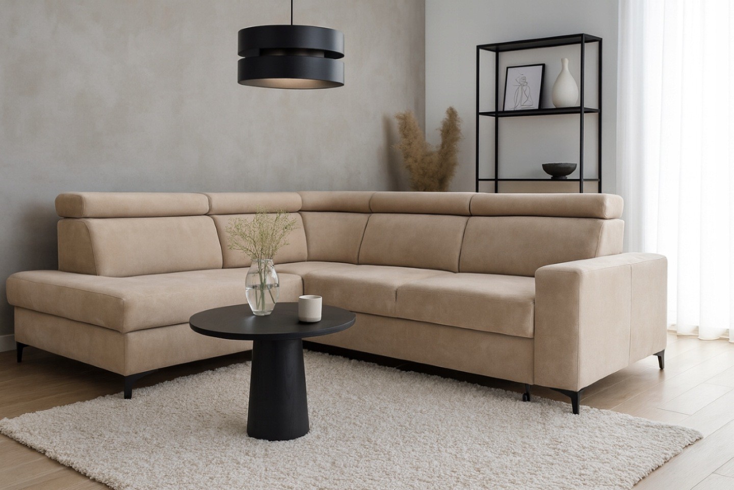 Nowoczesny narożnik z regulowanymi zagłówkami, który umożliwia dopasowanie oparcia do wysokości osoby siedzącej.