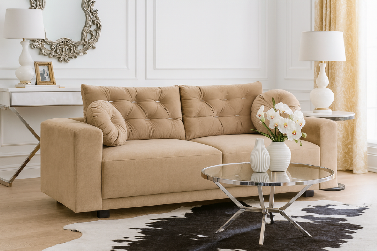 Sofa elegancko prezentuje się w przestronnym salonie jak i kameralnych pomieszczeniach. Komfort i wogoda podczas codziennego użytkowania. Kanapa posiada funkcję spania oraz pojemnik na pościel.