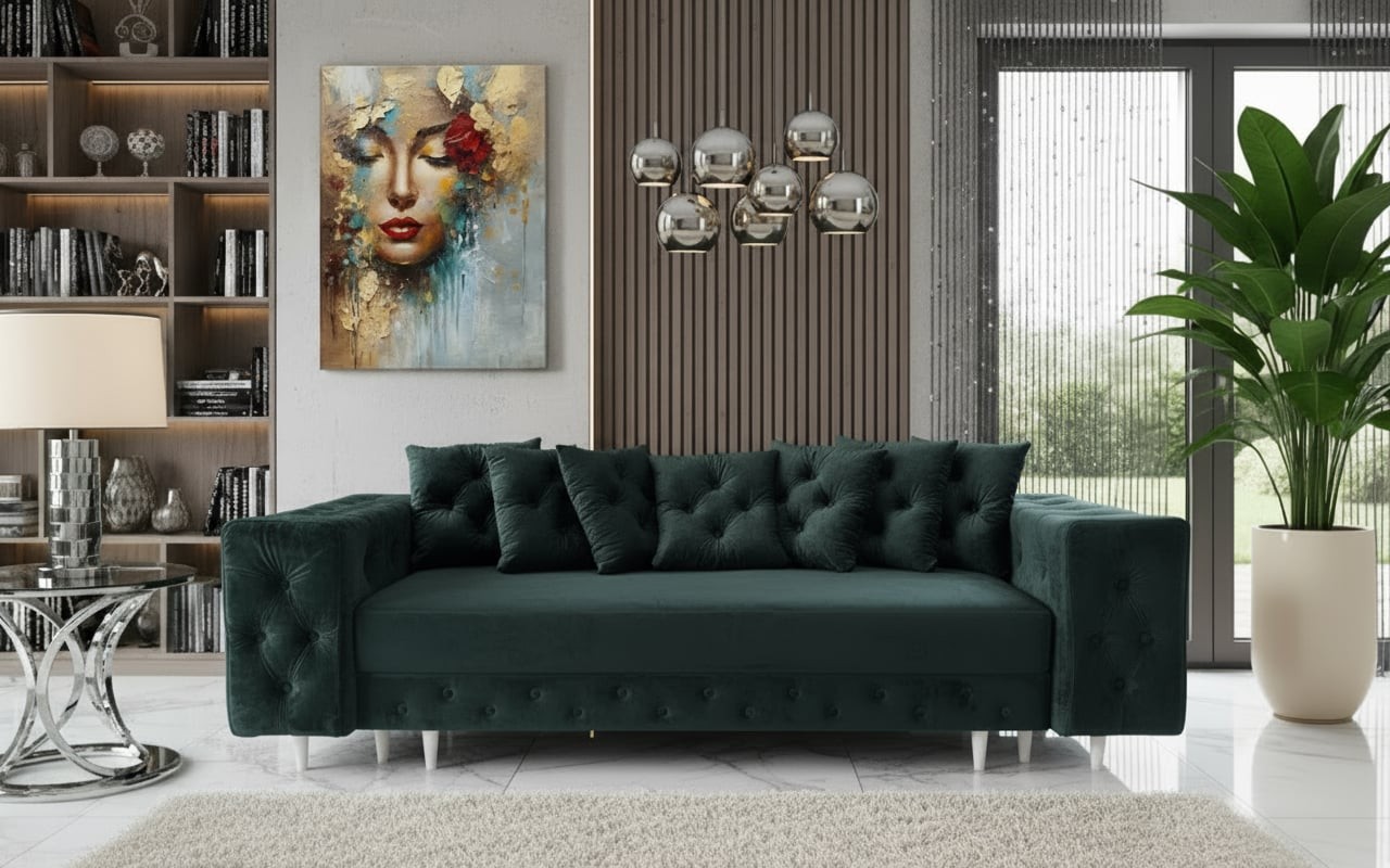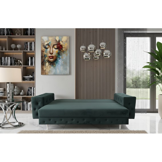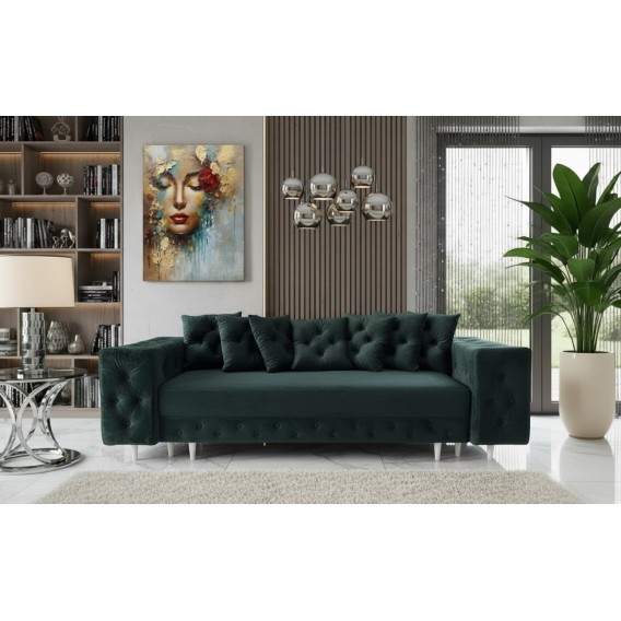 Szerokie, okazałe boki sprawią, że sofa świetnie wkomponuje się w Twoją przestrzeń w salonie a goście będą pod wrażeniem. Liczne poduszki na siedzisku z guzikami w tkaninie nadają charakteru.