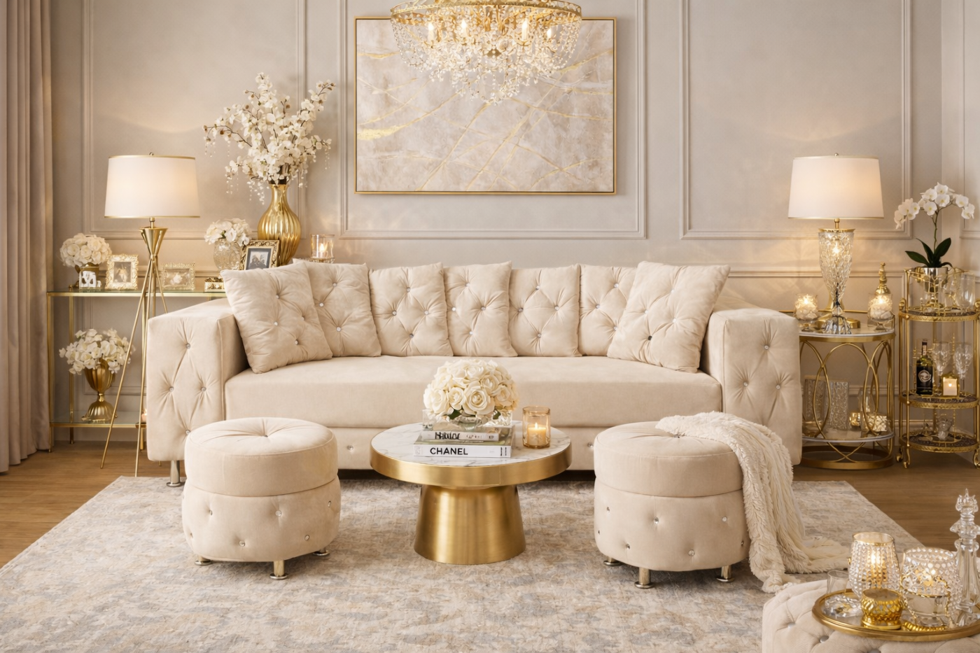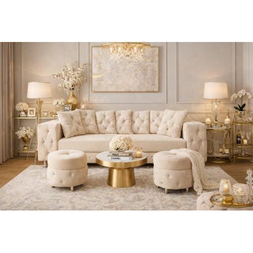 Zestaw mebli wypoczynkowych do salonu w stylu Glamour. Z pewnością umożliwi przyjemny wypoczynek po ciężkim dniu w pracy. Zachwyci gości podczas odwiedzin. Sofa elegancka z kryształkami, szerokimi okazałymi boczkami które nadają niepowtarzalnego charakteru. Dwie pufy okrągłe.