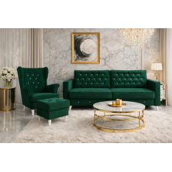 Zestaw mebli wypoczynkowych Bergen do salonu składający się z sofy i fotela uszaka z podnóżkiem. Z pewnością idealnie zaprezentuje się w pomieszczeniach w stylu Glamour czy eleganckim.