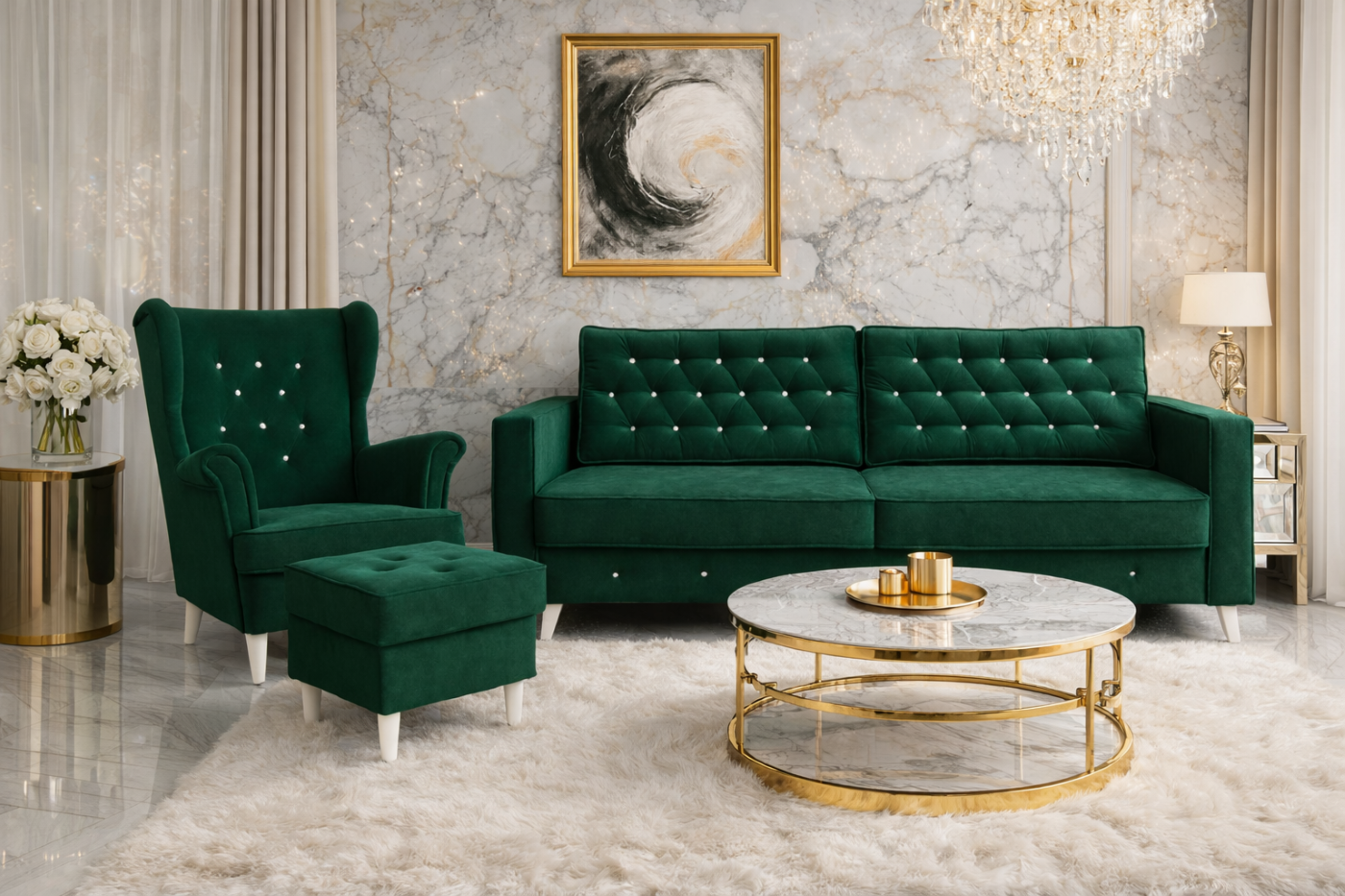 Nowoczesny komplet mebli z kryształkami z pewnością przykuje uwagę gości w Twoim domu.