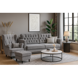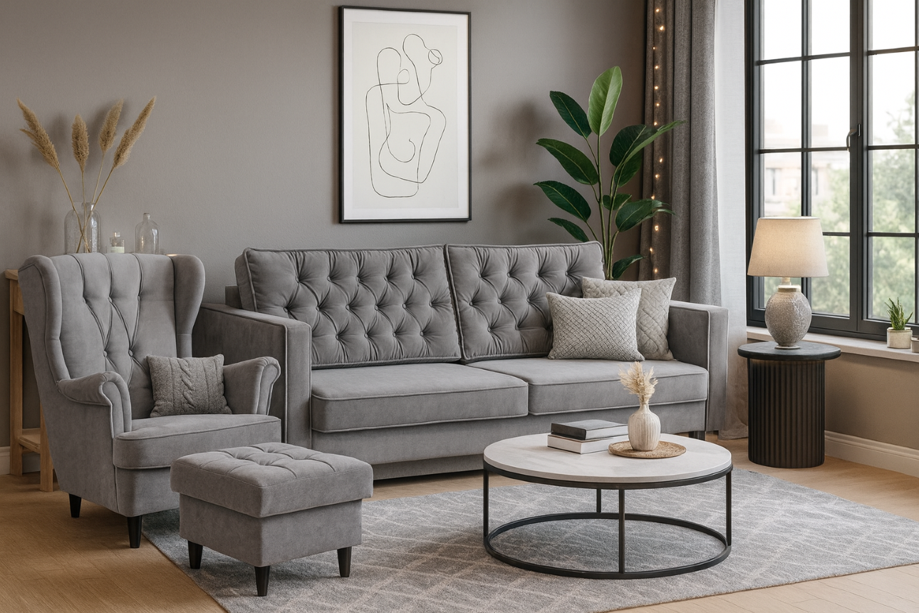 Nowoczesny komplet mebli z przeszyciami i guzikami w kolorze tkaniny