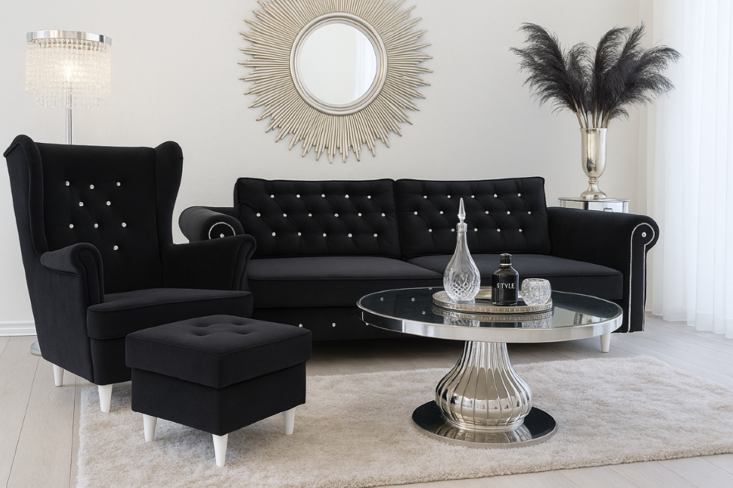 Nowoczesny komplet mebli z kryształkami z pewnością przykuje uwagę gości w Twoim domu.
